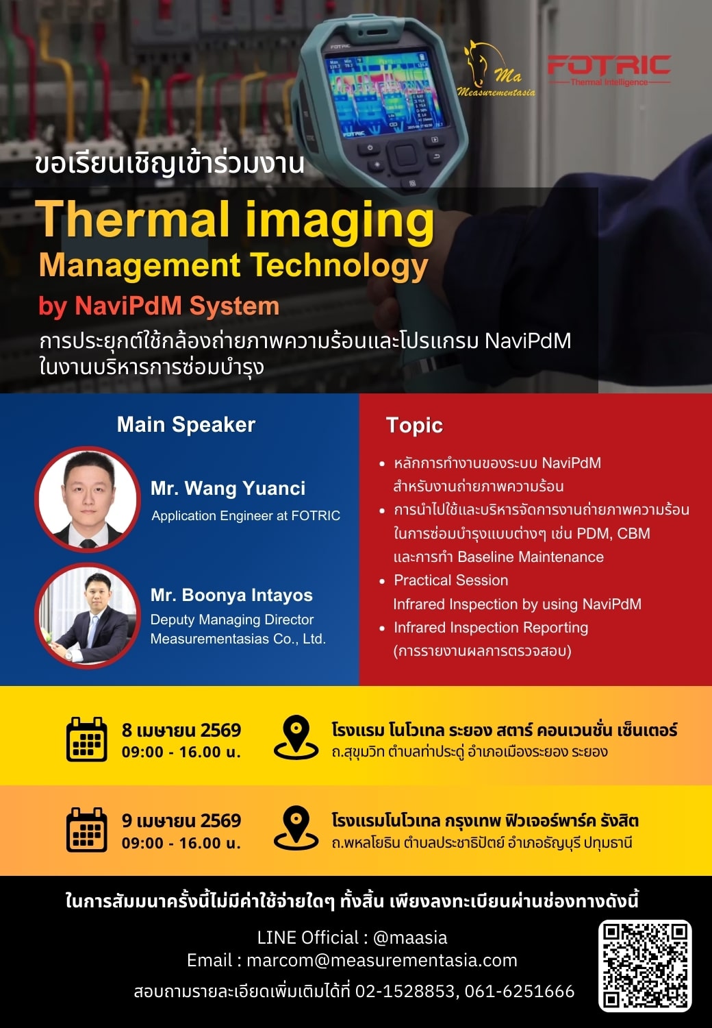 บริษัท เมสเชอร์เมนท์เอเชีย จำกัด ผู้แทนจำหน่ายหลักสินค้ายี่ห้อ FOTRIC ในประเทศไทย, เมียนมาร์, ลาวและกัมพูชา มีความยินดีขอเรียนเชิญท่านเข้าร่วมงานสัมมนาวิชาการภายใต้หัวข้อ “Thermal imaging management technology by NaviPdM System (การประยุกต์ใช้กล้องถ่ายภาพความร้อนและโปรแกรม NaviPdM ในงานบริหารการซ่อมบำรุง)”